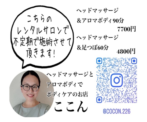 ここんさんの施術する「絶対的心地よいボディケア」でぜひ、日頃の身体の疲れを癒してみてください。